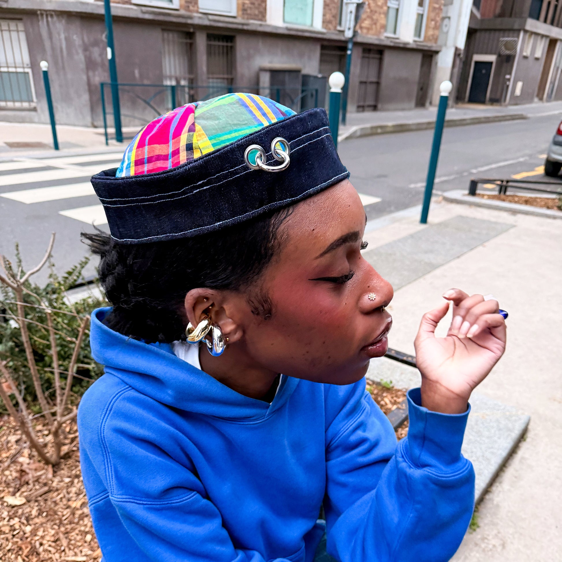 Un chapeau intemporel inspiré des chapeaux de marin revisité avec une partie en denim et la partie supérieure en madras multicolore rappelant les Antilles.